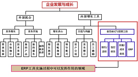 在決定企業(yè)成長(zhǎng)發(fā)展的諸多因素之中,即包含外部市場(chǎng)、行業(yè)、政策的因素,也有企業(yè)內(nèi)部的很多因素。一般意義上說,ERP作為企業(yè)日常管理的工具與平臺(tái),更主要的是在企業(yè)的內(nèi)部管控上發(fā)揮作用,涉及組織、流程、物料管控、計(jì)劃管控、質(zhì)量、成本、財(cái)務(wù)、風(fēng)險(xiǎn)管控等。